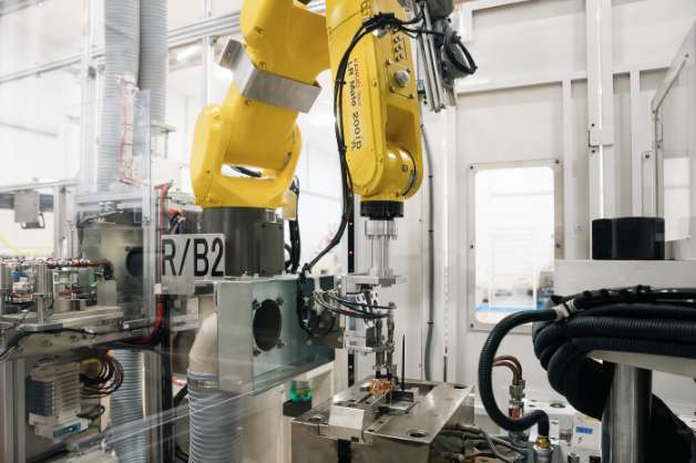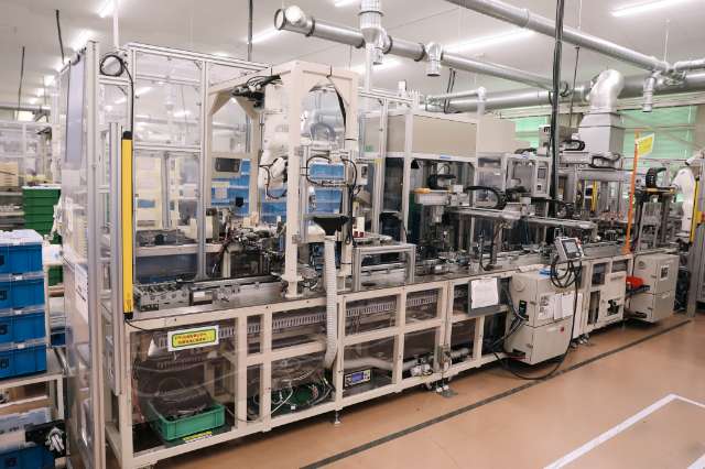 「インサート成形→冷却→先端潰し→仮カシメ→熱カシメ→寸法検査→電気検査→箱詰め」の8工程を一貫して行う全自動ラインは、高効率・省スペース・省人化を実現しており、精密温調による樹脂型で高品質かつハイサイクル生産を可能にするとともに、各工程が独立した制御を採用することで、生産状況に応じた柔軟な対応を可能にしています。