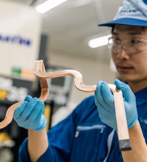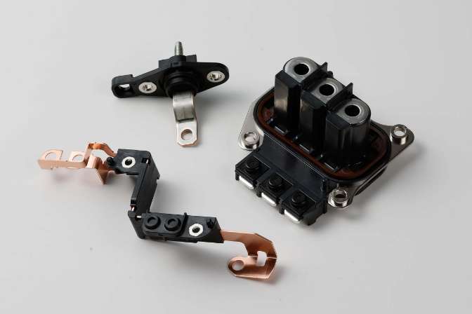 100sqクラスの銅平角線材を用いたバスバーで、複雑な配線形状をコンパクトに一体化できます。