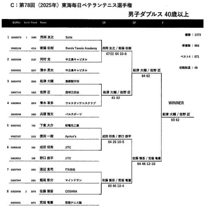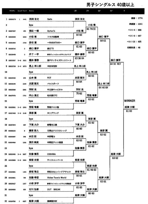 今大会の男子シングルス40歳以上トーナメントは、25選手から構成され、男子ダブルス40歳以上は、8チームから構成されました。