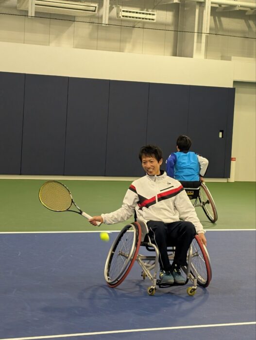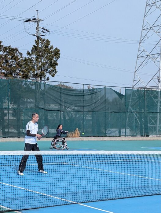 2月16日に、当社が本年度から法人会員になりました諸の木テニス倶楽部で、車いすテニスの普及を目的としたニューミックス(健常者と車いすプレーヤーがダブルスを組む)交流会が開催され、当社からは3名がが参加しました。今回の車いすテニスの参加者の中には、主催会社の日本ガイシ殿が支援し世界で活躍されている城智哉(タチトモヤ)選手、佐々木千依(ササキチヨ)選手、松岡星空(マツオカセイラ)選手も一緒にプレーして頂きました。