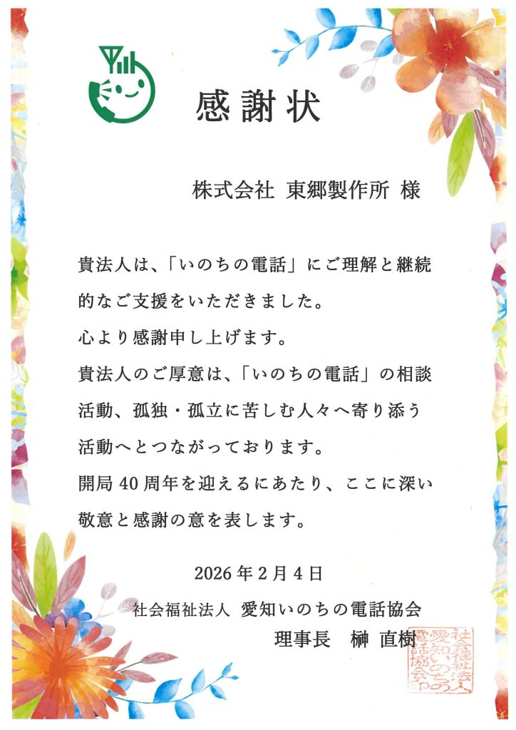 「いのちの電話」への継続的な支援に対する感謝状を拝受いたしました(2026年2月4日付)。