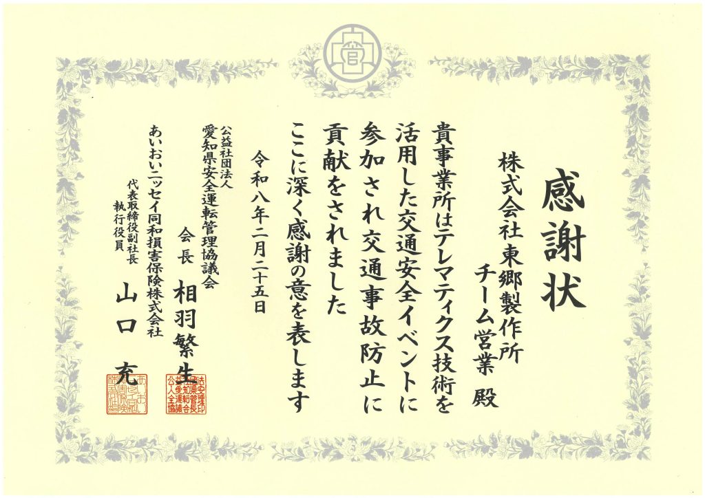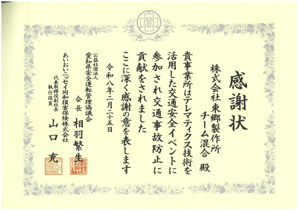 愛知県安全運転管理協議会様より感謝状を拝受しました 受賞実績 2026.4.17 当社はこのたび、愛知県安全運転管理協議会様より感謝状を拝受いたしました。本表彰は、当社から参加した2チームがテレマティクス技術を活用した交通安全イベントにおいて、優れた成果を収めたことによるものです。参加者からは、自身の運転傾向を客観的に把握することで、交通安全に対する意識付けに繋がったとのフィードバックを得ております。当社は、今後も従業員の安全運転教育および交通事故防止活動を推進し、安全運転管理体制の継続的な改善を通じて、地域社会に貢献し信頼される企業を目指してまいります。 前へ お知らせ一覧に戻る