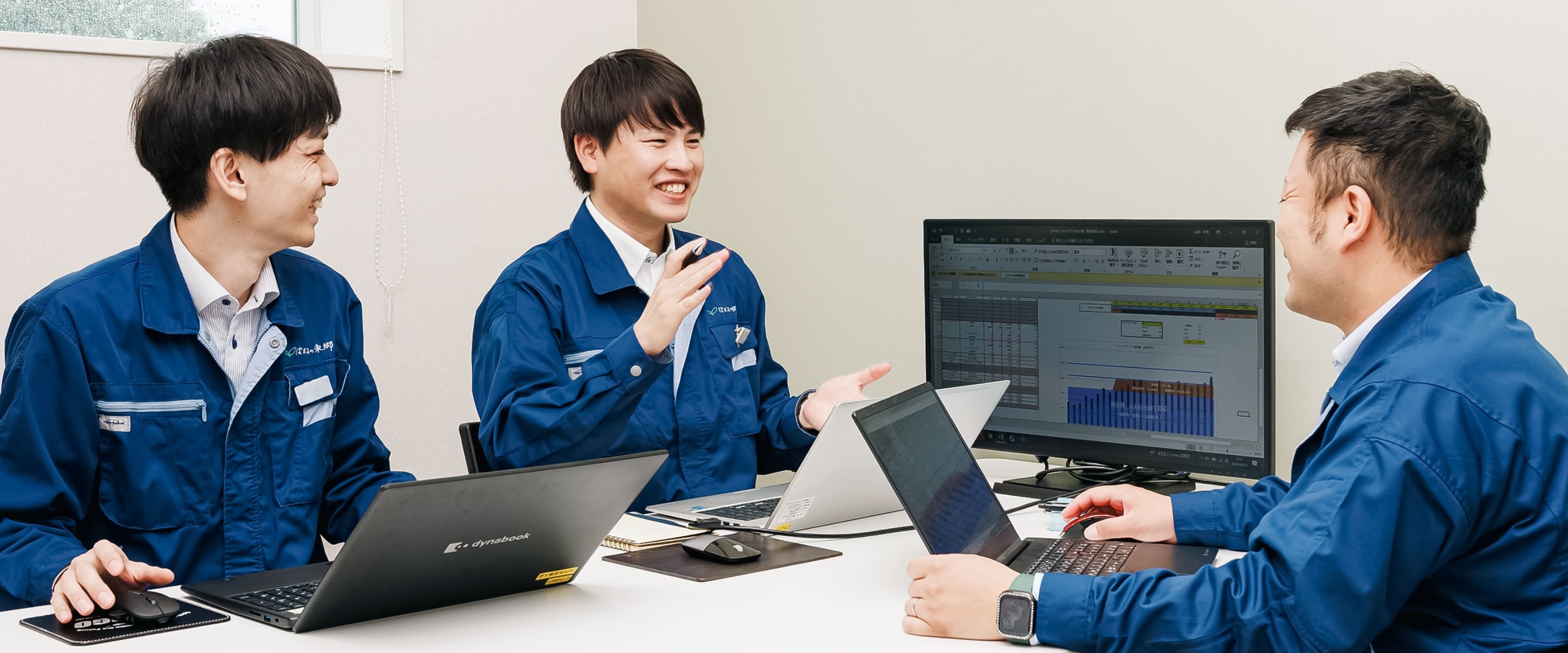 プロジェクトを成功へ導く生産企画課は東郷製作所及び海外拠点の生産体制検討を始め、設備導入の投資管理や日程進捗、プロジェクト案件の全体進捗管理をメインに扱う部署です。日々の業務は関連会議の司会進行、それにまつわる報告資料作成、また弊社で生産している製品の原価計算などを行っています。海外拠点プロジェクトでは、現地スタッフとのWeb会議をはじめ、海外出張で現地を訪問するチャンスもあります。