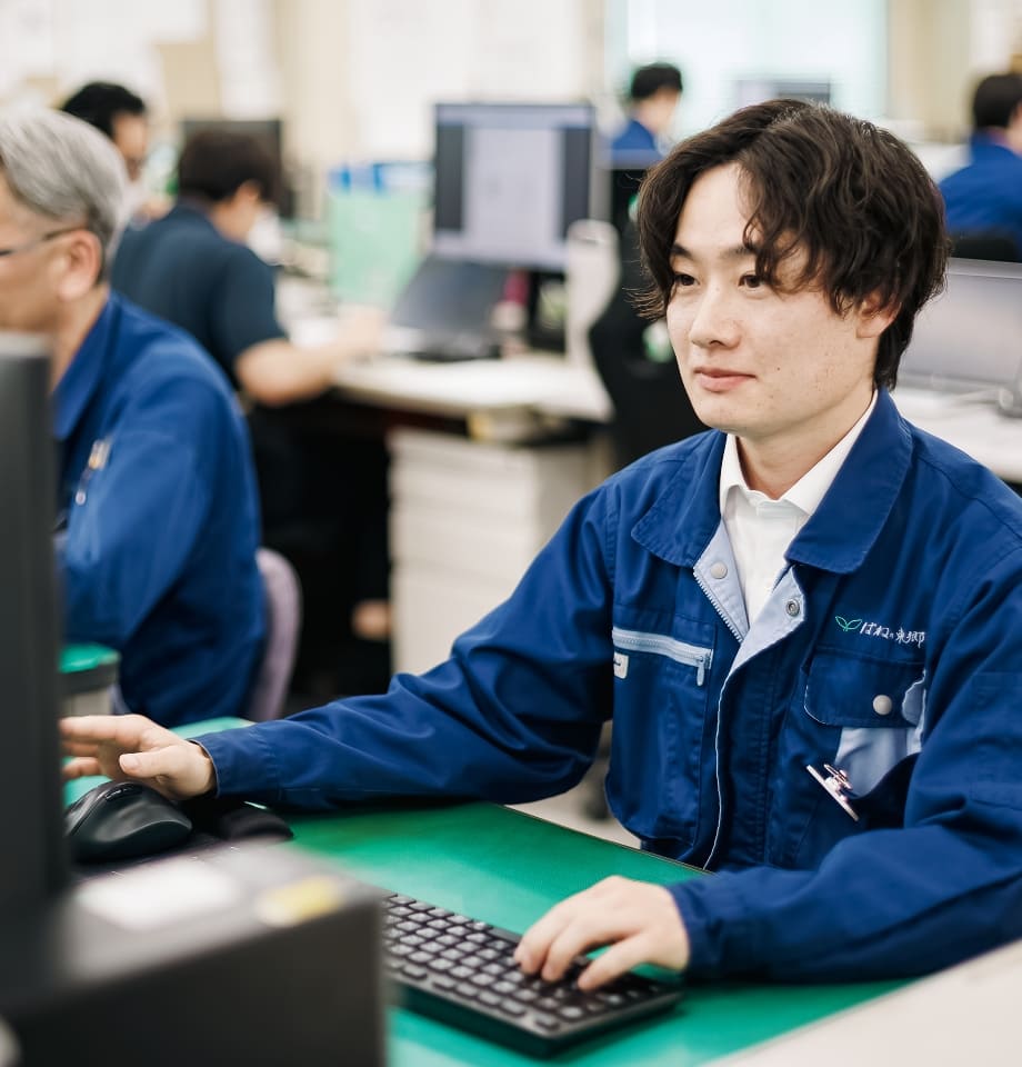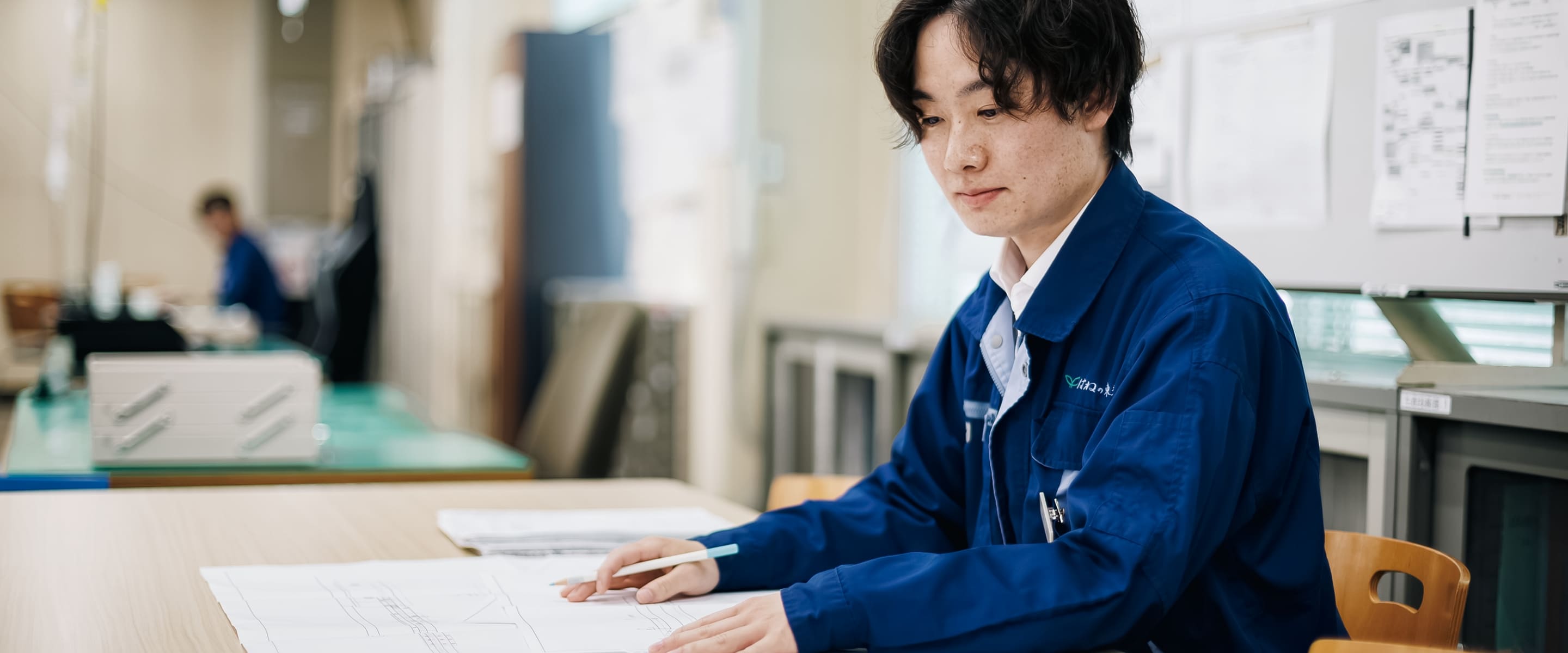 量産の土台を築く金型設計課はプレス金型や樹脂金型の設計と、金型に関わる工程の設計を行う部署です。私はプレス金型を担当しており、グローバル営業部が製品を受注したら係内で製品図を見ながら打ち抜き・曲げなど金型でどう加工するか話し合い金型の構想を決めてCADで設計をしています。また、工程設計も同時に進めて1、2工程目では製品のどこの寸法を測り工程管理をするのかなど、不良を出さない工程作りをしています。その他にも製造と協力し合い量産品の改善活動をしています。